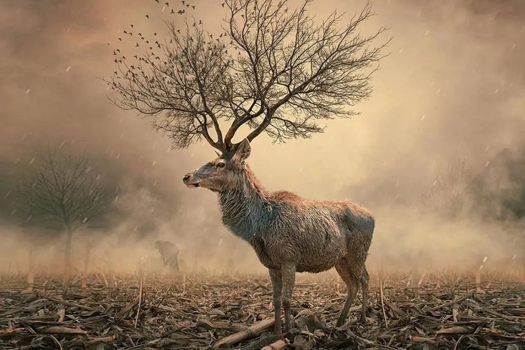 今年的交配将会极其艰难,棕鹿对此早有预感。随着年岁渐长,棕鹿步入了老年,精力也大不如前。也许正因为如此,它一早就径自驱赶着鹿群离开了,它想避开可能发生的激战。情欲的萌动早就让鹿群忘记了长幼,年轻的雄鹿都挑衅似的逼近棕鹿。棕鹿的尊严受到挑战,这驱使它加入了战斗。它有点不敢靠近眼前这个顶着巨大鹿角的大家伙。它一旦加入到真正的战斗中,最后只剩下两个大家伙,那将会怎样呢?棕鹿又一次看着对手。它俩都藏起心中对彼此的忌惮,瞪着对方,后退几步,然后径直冲了上去。只听“咔嚓”一声,紧接着,此起彼伏的“咔嚓”声就填满了耳朵。分成两列相向而立的群鹿加入到这场前所未有的大战中来。年轻的雄鹿顶着两只刚长起来的犄角,划破了空气。白桦树皮般坚硬的额头撞击在一起时,仿佛有火光窜起。因情欲而起的生死之战,是真正的雄性之间的战斗。当一群雄鹿顶着坚硬的犄角,像子弹一样冲向对方,鹿角仿佛镶上黄金一样相互撞击时,这场情欲之战显得那么美丽,又那么壮烈。在阿勒泰早秋浓重的雾霭中,这场战斗持续了将近三个小时才接近尾声。直到浓雾散去,战斗才逐渐停止。在秋日雾霭中若隐若现的泛黄的山丘上,只剩下棕鹿和那个刚刚闻到一丝情欲气息的年轻雄鹿。棕鹿知道真正的王者将在这场决斗中诞生。这样的战斗不仅属于鹿群,在自诩智慧的人类当中也从未消失过。人与人的战斗比鹿之间的战斗更加血腥。人们不会像鹿一样,在结束一期一会的战斗之后重新和睦相处,而是不达目的决不罢休。是的,棕鹿不明白为什么动物总是被人包围,不明白为什么人那么喜欢鹿角,它因此对人类一直怀有仇恨。哪里有决斗,哪里才有公正。棕鹿感觉视线开始模糊,才知道自己真的累了。年轻雄鹿的进攻让它重新清醒起来。它强迫自己抬起因受重创而眩晕的头,睁开眼睛,看见年轻雄鹿正站在对面,龇牙瞪着它。棕鹿一旦放松紧绷的神经,沉重的头颅就会倒在脚下乌黑的土地上。眼前的现实提醒了它,它决定保住往日的尊严。即便如此,它还是在年轻雄鹿的身上看到了自己永不复返的青春。它又闭上了眼睛。如果不是年轻雄鹿一边刨地一边发出挑衅的声音,棕鹿恨不得即刻死去。年轻雄鹿知道,棕鹿已经虚弱到了极点,但它并没有一头将棕鹿撞死,而是挑衅地要它继续决斗。