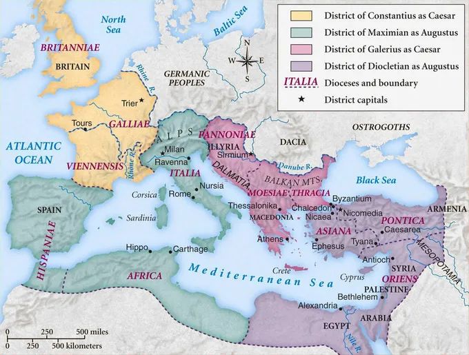 293年,戴克里先为自己和马克西米安分别指定两位副手。伽列里乌斯(Gaius Galerius,260—311年)是戴克里先的副手,君士坦提乌斯一世(Constantius I, 250—306年)是马克西米安的副手,两位副手加恺撒称号,地位略低于奥古斯都称号,两帝共治变成四帝共治。为此,进一步划分两位皇帝的辖区,戴克里先治理埃及和亚洲部分地区,治所仍在尼科米底亚;伽列里乌斯治理巴尔干半岛,治所在西米乌姆(Sirmium,今贝尔格莱德附近);马克西米安治理意大利和阿非利加,治所仍在米兰;君士坦提乌斯治理高卢、西班牙和不列颠,治所在今特里尔。可以看出,两位新增的副帝被分配到帝国北部的漫长边境上,以抵御愈来愈强劲的蛮族威胁。四位君王分治帝国的四个部分,各人有各人的宫廷,各人指挥一支军队。四位皇帝仿佛四位神一样,分散在帝国的四个方向保卫帝国,帝国不再有政治中心。