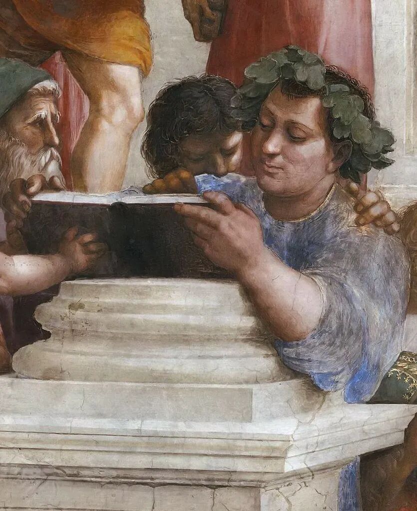 ▲ 拉斐尔《雅典学园》中的伊壁鸠鲁像(头戴叶冠者)