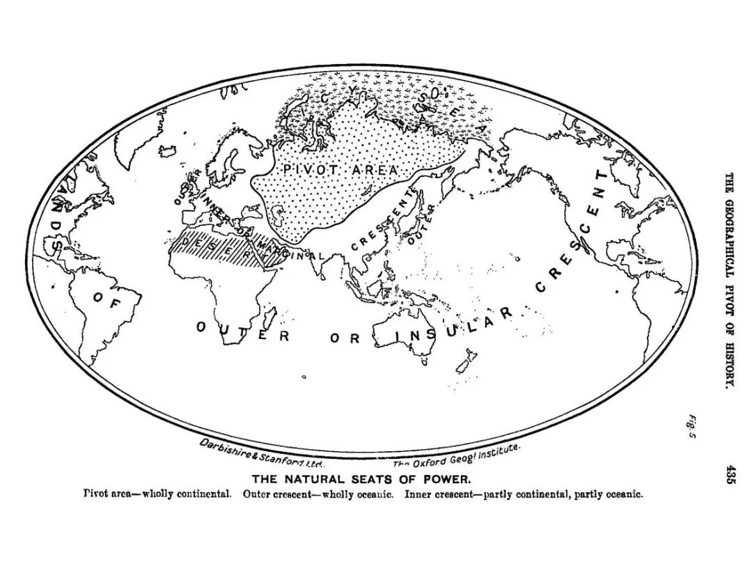 然而,我们却不能说,麦金德的二元性地理单元划分错了。毕竟,内外新月形地带的政治地理单元划分才是麦金德的落脚点,它表达的是大英帝国当时的势力范围以及对全球的支配态势——麦金德心目中的“后哥伦布纪元”的世界政治地理格局。麦金德致力于论证的欧亚大陆的二元性地理结构,不过是为了证明他的地缘政治观的核心要义:既然欧亚大陆心脏地带对西欧人来说是恒在的生存威胁,那么,这种包围态势就需要永远保持——麦金德让内新月形地带的西沿向心脏地带推进了一大步,为的就是紧缩这种包围态势。