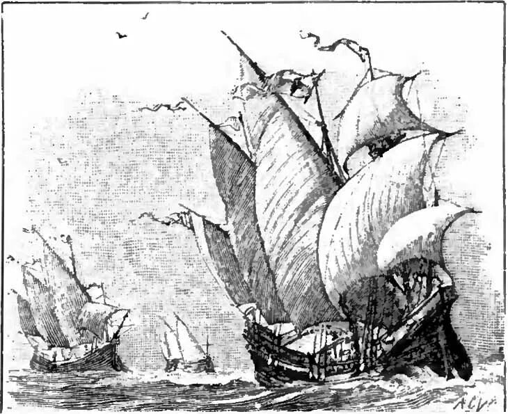 ▲ 1492 年哥伦布远航船队的三艘船只——圣玛丽亚号、平塔号和尼娜号