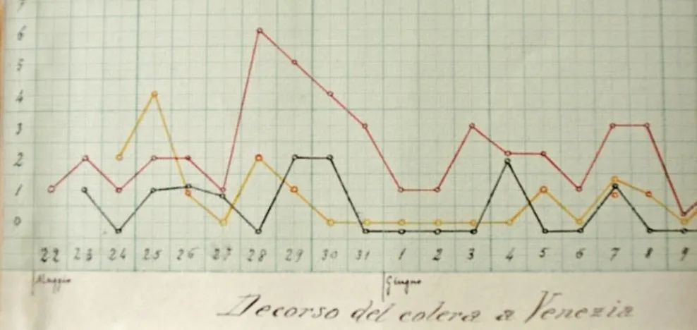1911年5月22日至6月9日期间威尼斯霍乱确诊病例及死亡人数。横轴为日期,纵轴为人数。红色曲线表示在医院确诊的霍乱弧菌携带者病例,黄色曲线表示携带霍乱弧菌但并未由医院确诊者人数,黑色曲线表示霍乱感染者死亡病例。