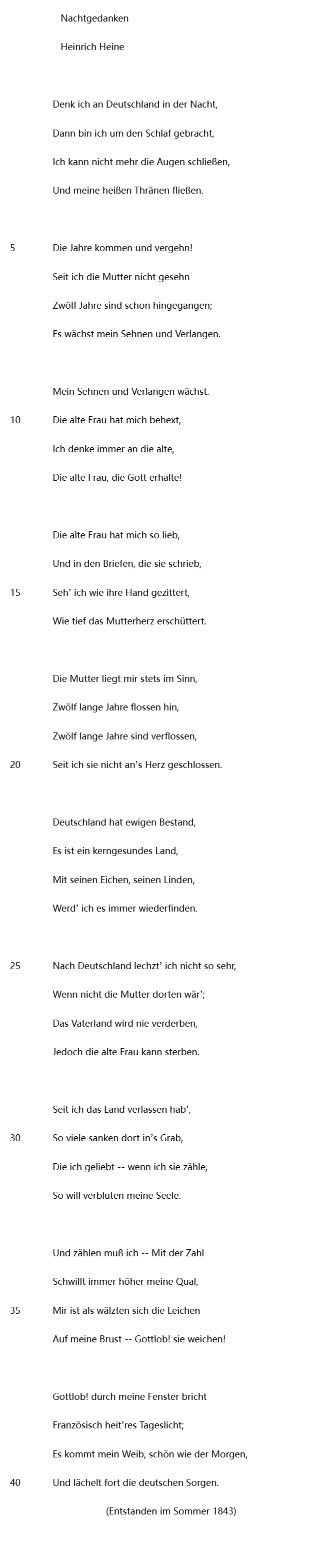 《夜思》作于1843年夏。那时海涅在巴黎的生活已经进入到第十二个年头,其间他未曾回过德国。在巴黎的生活究竟是旅居还是流亡,这在海涅身上是值得探讨的。毕竟,受到七月革命的感召,1831年5月,他是自主而非被迫迁居巴黎的。巴黎可以说是他所选择的第二家乡(Wahlheimat)。黑夜的遐想与白天的日常构成了全诗最基本的二元对照。前者指向过往的故土,后者回到当前的他乡。而这两方面所占的比重是不同的。第二家乡所代表的当下日常,诗人只分给它了十节中的最后一节。前九节写的都是夜里对家乡母亲的思念,对逝去朋友的怀想。