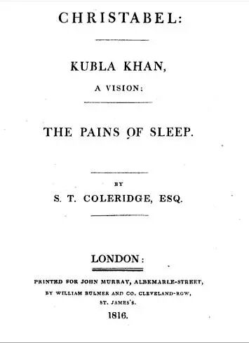 综上所述,柯勒律治从一开始就不是灵感至上论的拥护者,而是强调灵感与理性的辩证结合。尽管我们无法确知柯勒律治初写《忽必烈汗》的情形和动机,但我们可以想象,当诗人准备出版此作时,发现此诗纯灵感的写作方法和迷狂的诗魔形象跟自己的主张相违背,有所顾虑也就不足为奇了。序言为他提供了解释、反思和修正的机会。前文已经提及,跟“克鲁手稿”的附言相比,1816年序言要丰满、隐晦得多,有细致的环境渲染、神秘的人物描写和悬而未决的情节,可以说具备了微型悬疑小说的要素。值得注意的是,序言的前两大段用的是第三人称的“作者”,只是在最后一段(仅一句话)突然转用第一人称的“我”(I),表明诗人似乎有意要跟此诗保持距离。有研究者认为此举暗示序言的作者只是个编辑,而非写诗的人。换言之,柯勒律治可以将《忽必烈汗》一诗的作者看成是自己杜撰的一个形象,如此一来就可以跟这首纯灵感之作撇清关系,打消他心中的顾虑。事实证明,柯勒律治的顾虑是多余的,因为《忽必烈汗》在1816年出版后,反响甚微。这或许会让今天的读者感到诧异,但当时评论界关注的焦点是诗人同时出版的长诗《克丽斯德蓓》,而在有关《忽必烈汗》的数量不多的评论中,批评远多于赞誉。托马斯·摩尔附和柯勒律治本人的观点,说“我们眼前的这东西,毫无价值可言”哈兹里特说此诗不过证明了柯勒律治“就说胡话而言,全英国无人能及”。