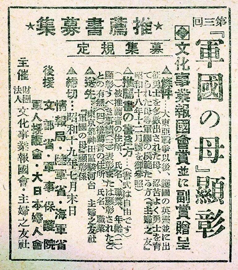 《主妇之友》1944年2月号刊登的“军国之母表彰活动”的广告