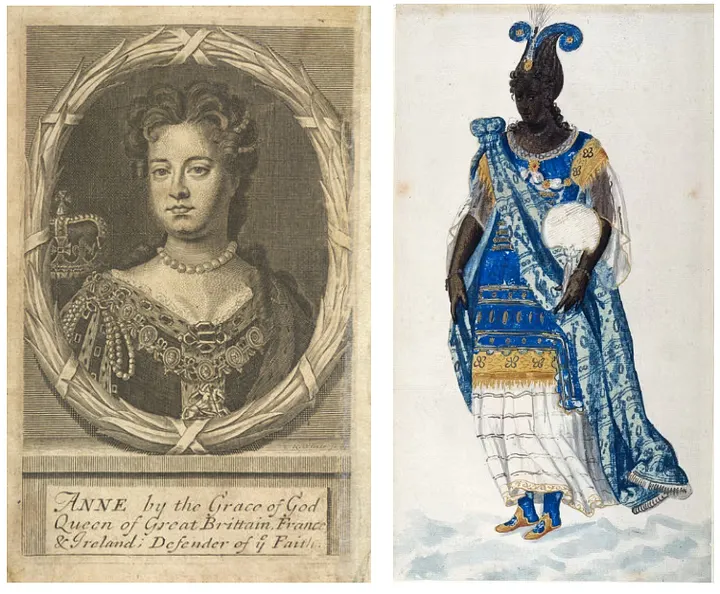 左图为安妮王后画像;右图是伊尼戈·琼斯为假面剧《黑》中“尼日尔之女”角色绘制的服装设计草图。