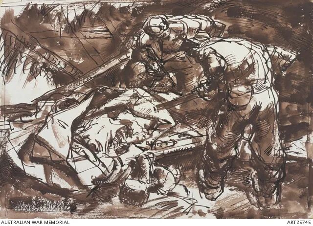 这幅由澳大利亚艺术家艾弗·希尔(Ivor Hele)创作的画作描绘了两位澳大利亚士兵在新几内亚苏安地区一座日军藏身地中发现食人证据的场景。